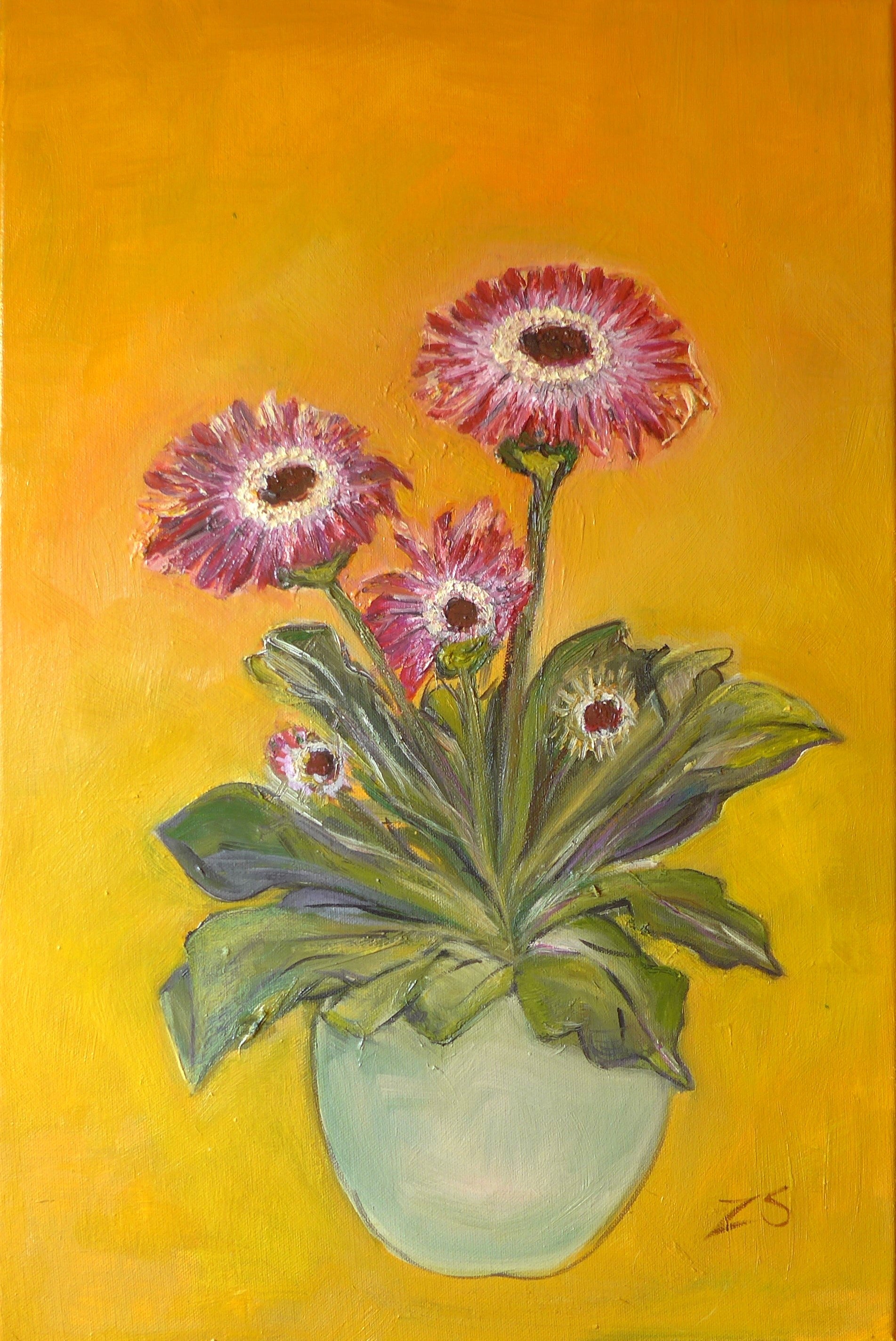 Die Künstlerin hat mit einer klaren und strukturierten Pinseltechnik gearbeitet, wodurch die Details der Blätter und Blütenblätter besonders gut zur Geltung kommen. Der Kontrast zwischen den kühlen Grüntönen der Blätter und dem warmen Gelb des Hintergrunds erzeugt eine harmonische Komposition, die dem Betrachter ein Gefühl von Freude und Lebendigkeit vermittelt.